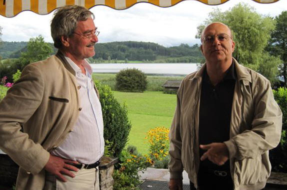 Well, my attempt was to see everything there was in Munich recommended by Tom Neuhann but it looks like there is no time to see Schloss Nymphenburg this time. I'll find a way. At 3:45 we left Munich and John drove us the 59 miles south and then east to Lake Chiemsee and the town of Prien. I got this shot of the interesting Gasteig building (below left) as we headed toward the autobahn to Passau/Nurneburg. I have no idea why graffiti on this autobahn bridge says "Cosa Nostra 1860." Maybe someone can tell me.
