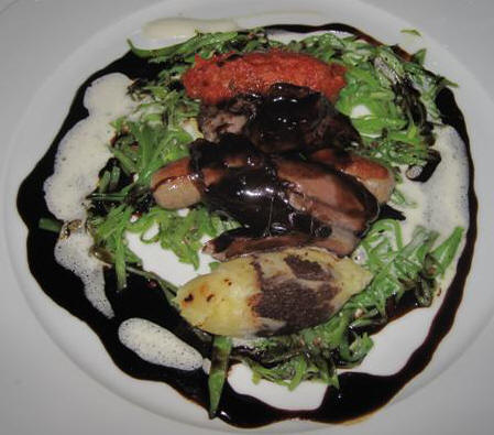 I got a little caught up in conversation and slipped a little when it came time to photograph all that we ate. I don't even remember which photo is of what. I had something with scallops (Krustentier und Zuckerbsencremsuppe Jacopsmuscel) followed by lamb's knuckle with bratwurst (Lammhaxe und bratwurst Kr�terjus Schnippelbohnen Tomaten Olivenstampf) (below right.) I should have paid more attention but the company was just too good.