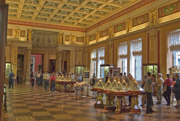 When I paid for our tickets, I also bought a camcorder permit allowing me to photograph anything I wanted. They give you a little sticker to put on your shirt so the guards ("Babushkas") know you are allowed to photograph. This is a sane and fair way to do it. I hand it to the Russians. If you want to photo; simply pay a small extra fee. I got a lot of Picasso works and those of many other famous Western artists. As usual, if you are not a fan of art, just slide past it all. But if you are slighlty interested in art, you will learn a lot. Here we go. To give an overall feel of this immense museum, I've included these beautiful stock photos (below) of some examples of the rooms.