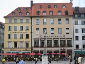 Right across from the restaurant is this beautiful baroque building (below, left) called the Helblinghaus after Sebastian Helbling who had a caf� here. It was built in the 15th Century and all the rococo was added 1730 (aerial stock photo below).