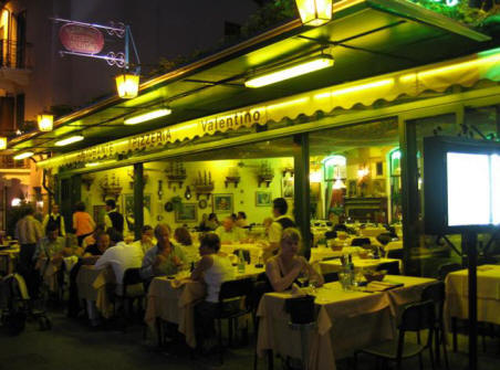 By 9:30 we headed to our old favorite restaurant, Valentino's on the main street. We saw the same guy we saw in 1997 on our first visit. I was really eager for my first real Italian meal in two years and was very hungry. We started with a pizza marguerite and then Marcia had insalata Caprese (tomatoes & mozzarella slices) while I had my favorite vitello tonato (cold thin slices of veal covered in a tuna sauce). Following this she had her secondi of assorted fish from the lake and I had a primi of tortellini with prosciutto in cream sauce. Then I ended with my secondi of branzino (sea bass).