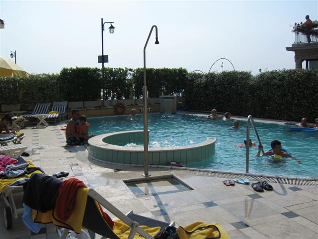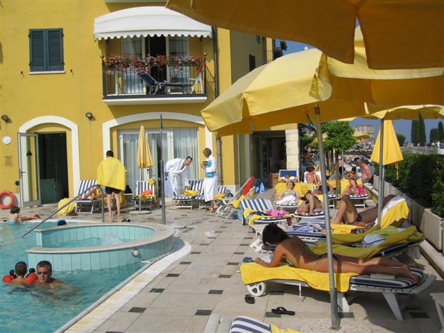 I threw my clothes on, closed my bags and moved to the new room.  When I got there, I went right back to bed at 1:30 and got up at 2:45 and now I am feeling well rested.  Once unpacked, I changed and had a cappuccino at poolside with my computer.  Marcia had already been swimming and told me the water is hot since this is a thermal pool heated by underground supply (the thermal waters is what Sirmione is famous for).