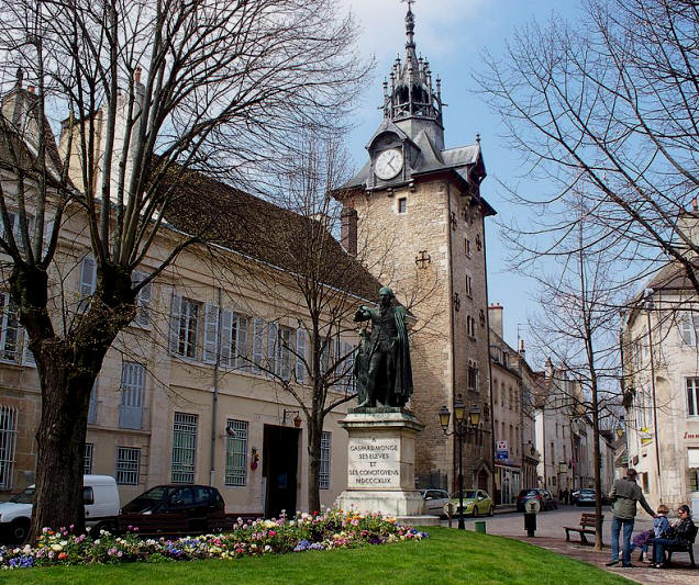 Note the statue in the little park nearby.  It is of a native son, Gaspard (Caspar) Monge (1746-1818,) Comte de P�luse.  He was a mathematician and the inventor of descriptive geometry, the mathematical basis on which technical drawing is based.  Monge's protocols allow an imaginary object to be drawn in such a way that it may be modeled in 3-D.  During the French Revolution he served as the Minister of the Marine and was involved in the reform of the French educational system, helping to found the �cole Polytechnique.  Monge (right) died in Paris on July 28, 1818, and he was buried in a mausoleum in the famous Le P�re Lachaise Cemetery in Paris.  His remains were later transferred to the Panth�on in Paris where all the important French are buried.  This statue was erected in 1849.  His name is one of the 72 names inscribed on the base of the Eiffel Tower.